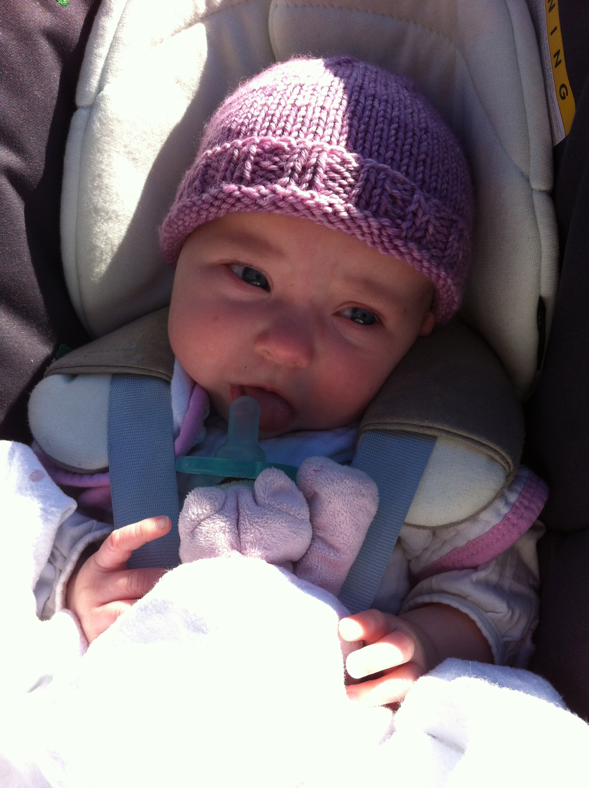 Wooly pink hat (Madelinetosh Tosh DK, Ms. Taylor) seeks companion for travel, outdoor adventure, learning new things. Began life as part of Tea Leaves Cardigan project, but turned into extra yarn and then stash. Finally found my calling as first item knit for new baby, when mother learned she was having a girl. Traveled with family to Wales: