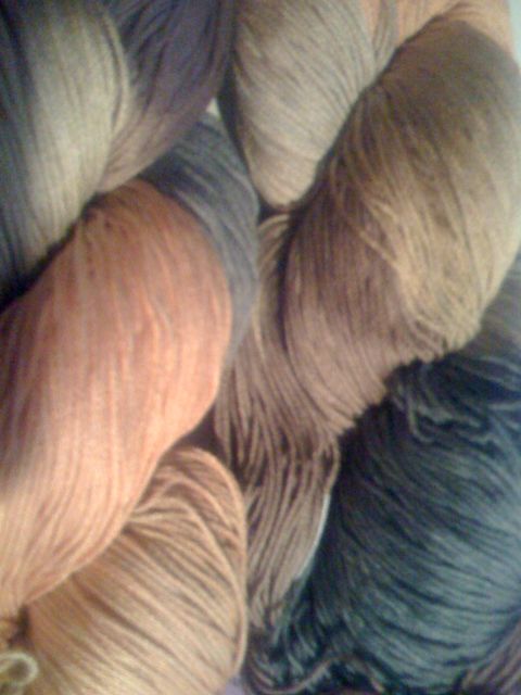 The camera on my iPhone isn’t picking up all the gradations, but notice the coppery green, golden peach, silvery grey. It’s a real delight to work with this yarn…if only I can find the right stitch pattern.