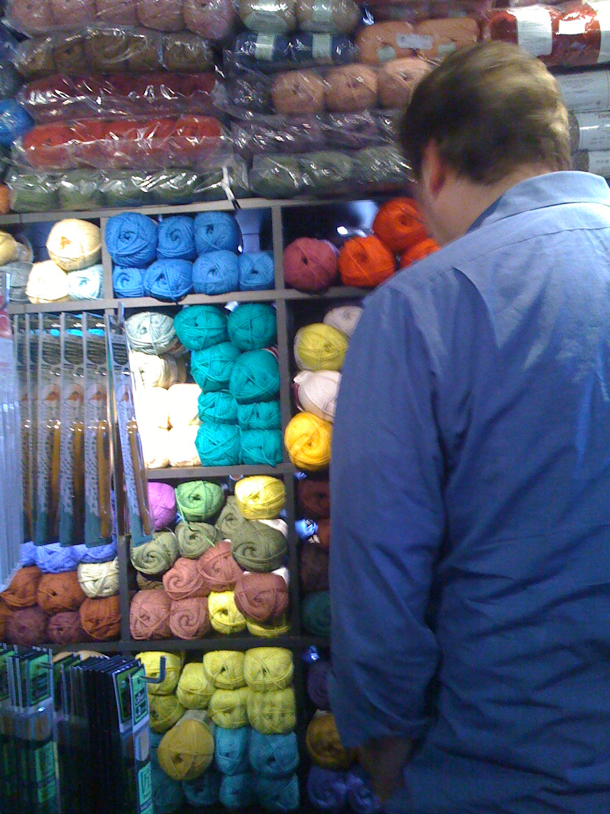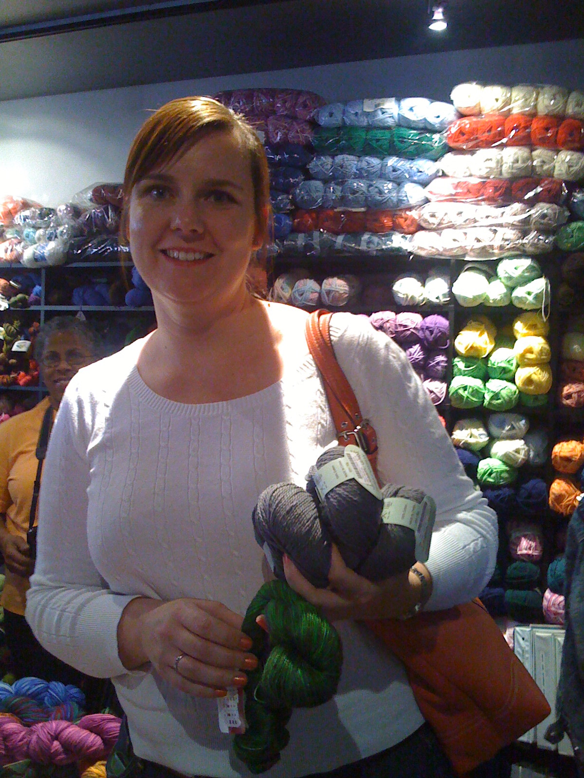 Meanwhile, Mr. Trask joined with me on this outing, because I had the two patterns in the book (and probably also because Sunday was my birthday). This man is a keeper. He patiently stood in the shop, looking interested in knitting and all the accoutrements thereof. His advice for surviving a yarn shop? “Bring an iPhone and pretend to be looking up things while you’re actually checking out Google Reader.”