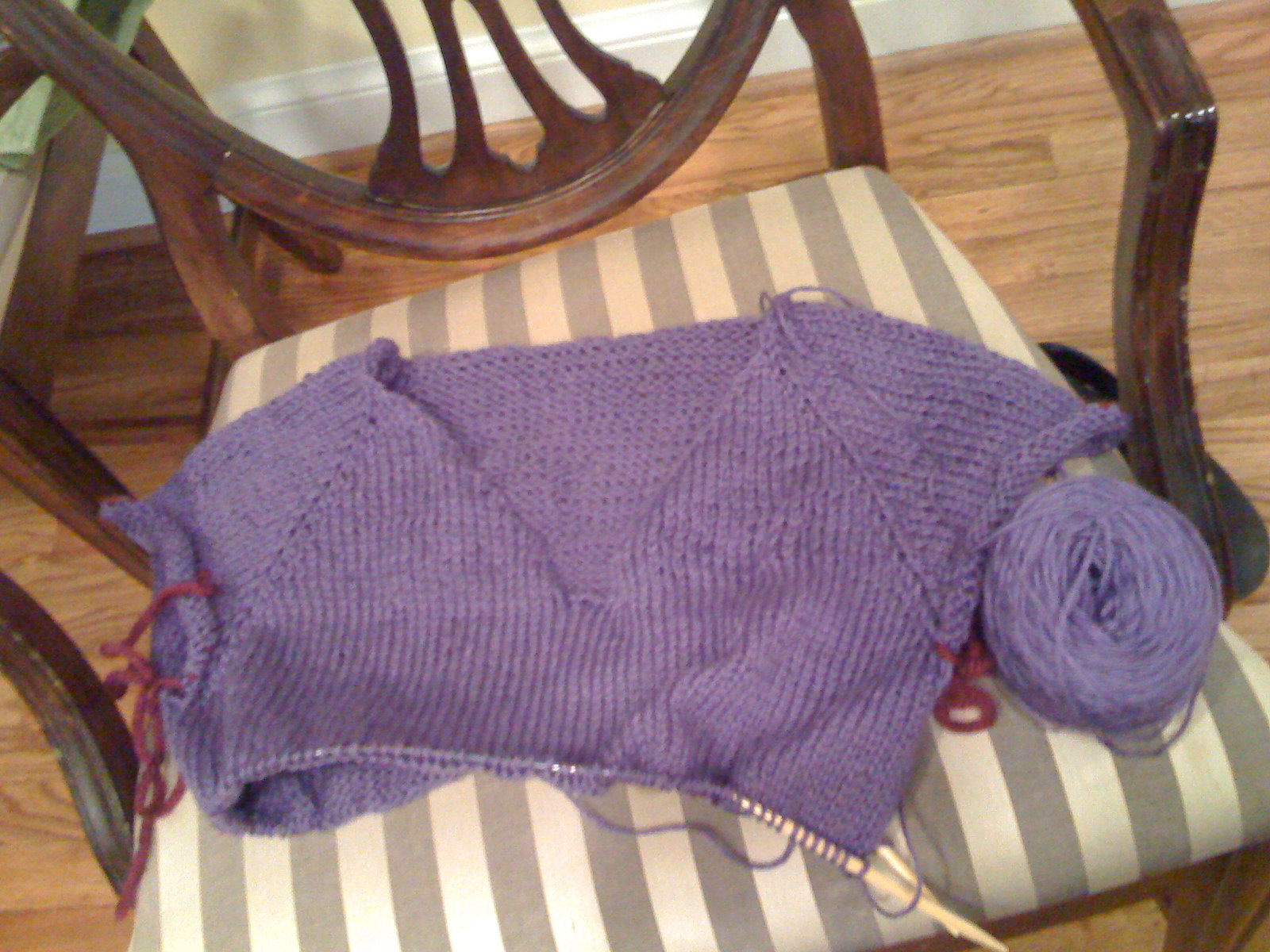 Anyway…it’s been a good week for the knitting. I’m plugging along in the Easy V-Neck, and so are my students (if one trusts their e-mail reports). I tried it on Tuesday evening, and (drumroll) it fits. The yarn’s wonderful, too – Louet MerLin Worsted (rav link), a blend of merino and linen. And I pulled it out of my stash, which means Stash Reduction continues unabated. Someday, the space under my bed will not be entirely taken up with yarn. But do we really want that? Maybe I should go buy some replacement yarn (rav link) right now…no, no, must resist.