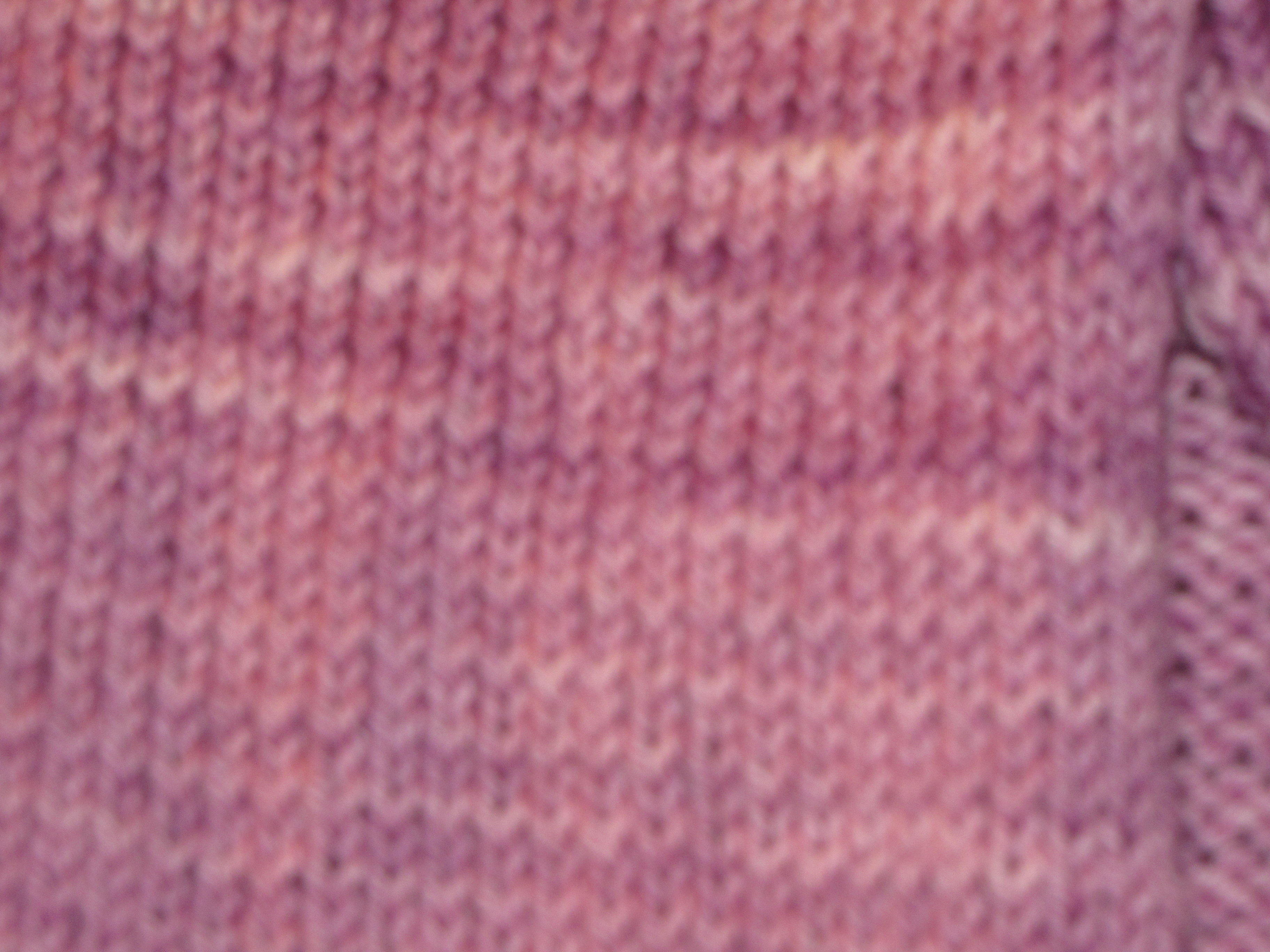 I bought the yarn for this beauty at fibre space, where I was helped by the lovely staff, and reminded that I should alternate rows with two different skeins in order to avoid obvious color problems due to differences between skeins. [Hand-dyed yarn varies from skein to skein. I know this. I have known this for quite some time. Check out Kay’s nifty post on hand-dyes yarns for more info.] As I told you all last time…I said, blithely, “Oh, I know. I probably won’t do it, though.”