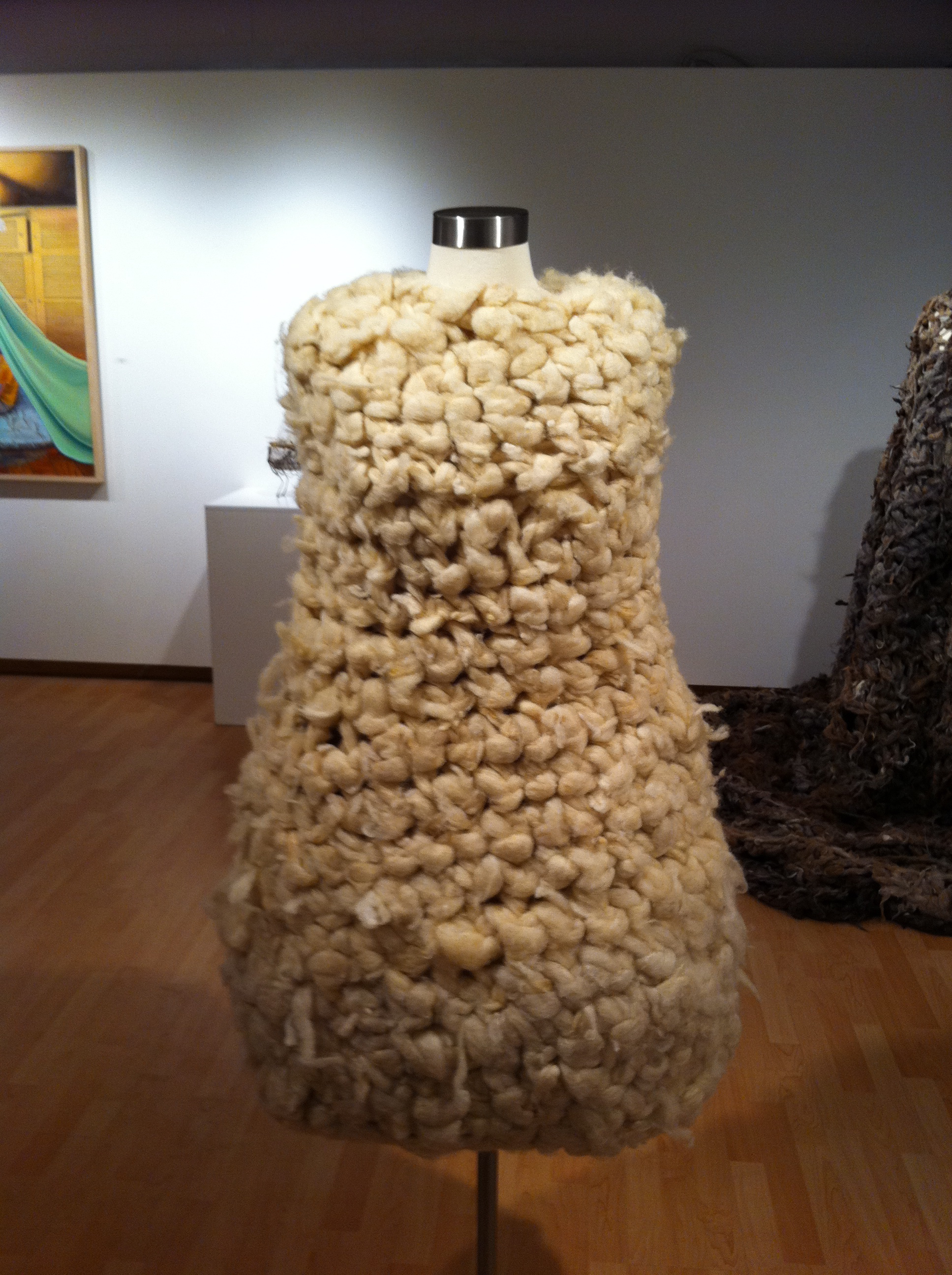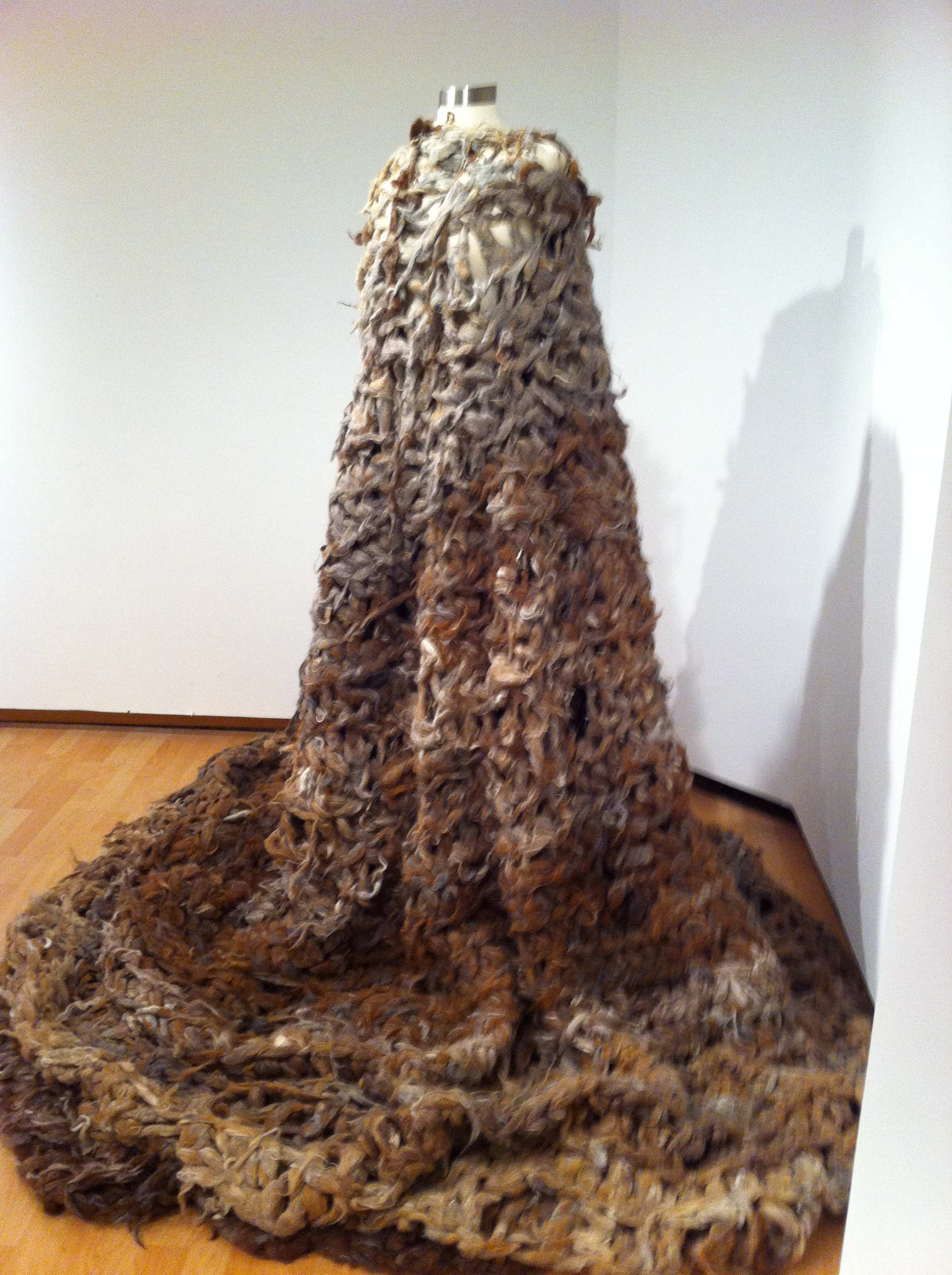 Mr. Trask and I took his mother to the Torpedo Factory a few weeks ago. It’s a special place for us; we got married there in 2006, and (before that, obviously) bought our rings there (from the illustrious Tony Man, a wonderful artist who, like Carolyn, has no internet presence). In the Target Gallery, we found The Nest Project, which included two pieces made of wool. Artist Gabrielle Duggan made them as part of her “spectrum” series of garments made of animal fibers, in which she strives to “honor the beings [the garments] are sourced from and connect the wearer to this source and the natural world.”