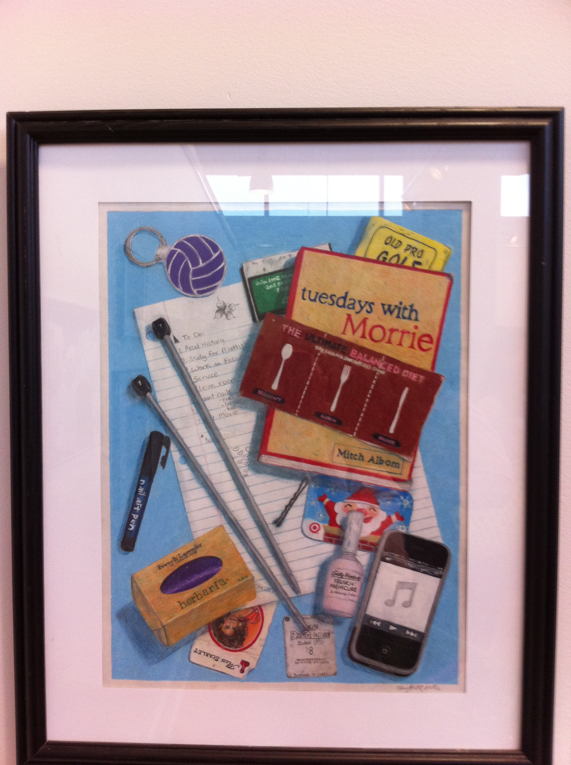 That’s right: along with nail polish, an iPhone, and the book “Tuesdays with Morrie,” Mary Beth Nalls uses knitting to procrastinate from doing her homework. At any rate, that’s what I took from the drawing. [That keychain in the upper left corner looked like a ball of yarn to me at first, but then I remembered that I have a one-track mine. I suspect it’s a volleyball.]