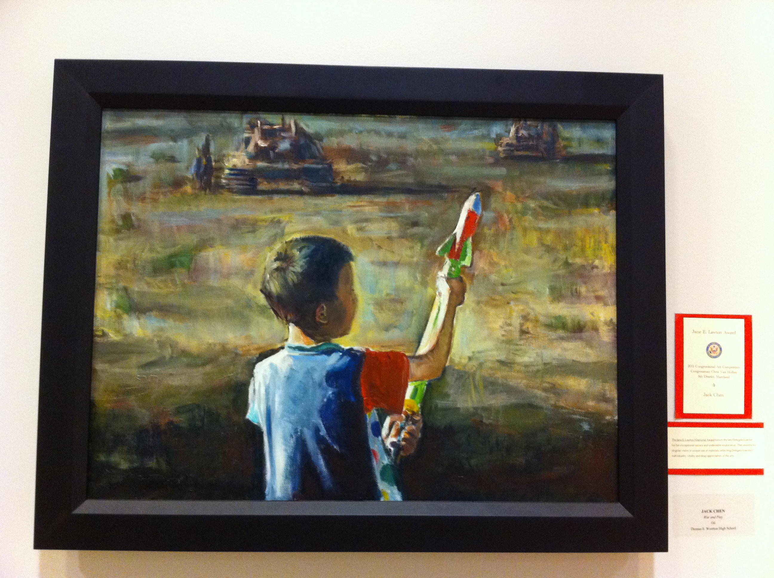 The winner of Mom’s award this year was Jack Chen of North Potomac High School; he created an amazing oil painting of a child playing with a toy rocket launcher in the foreground while tanks roll toward him in the background. The photo I took does not do this piece justice; it glows. It will be hanging in Congressman Van Hollen’s office for a year, so if you happen to be there do take a look!