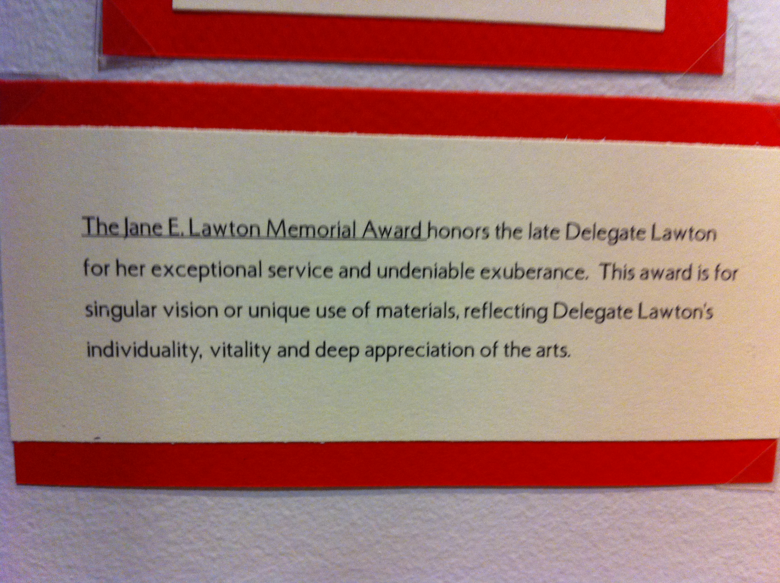 This award honors the late Delegate Lawton for her exceptional service, undeniable exuberance, and devotion to the arts. This award is for singular vision or unique use of materials, reflecting Delegate Lawton’s individuality and vitality.