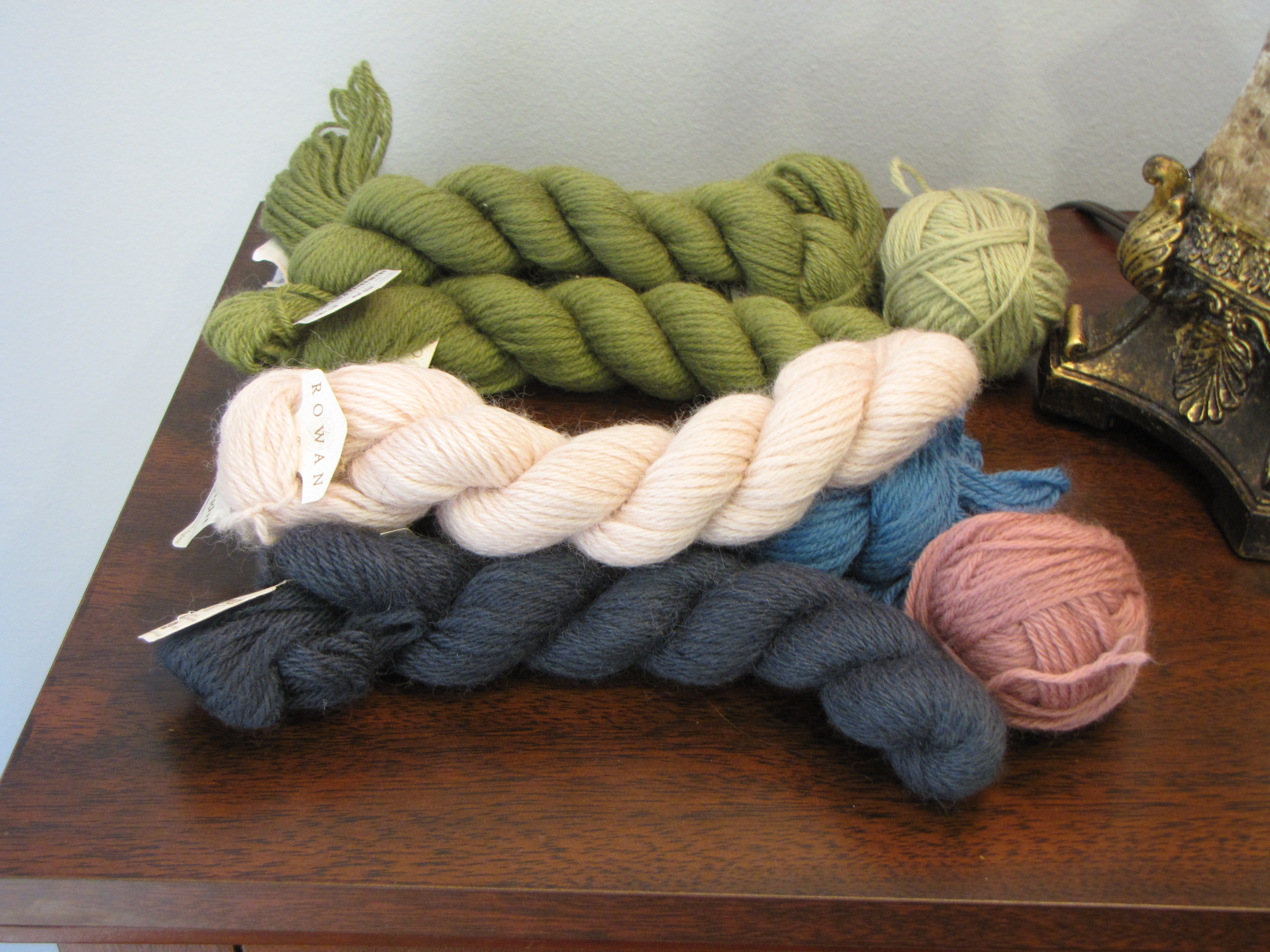 - Two lots (for two different lucky winners) of Rowan Lightweight DK: the greens at the top of the photo (above), and the pink/blue/charcoal combo at the bottom. Yummy.