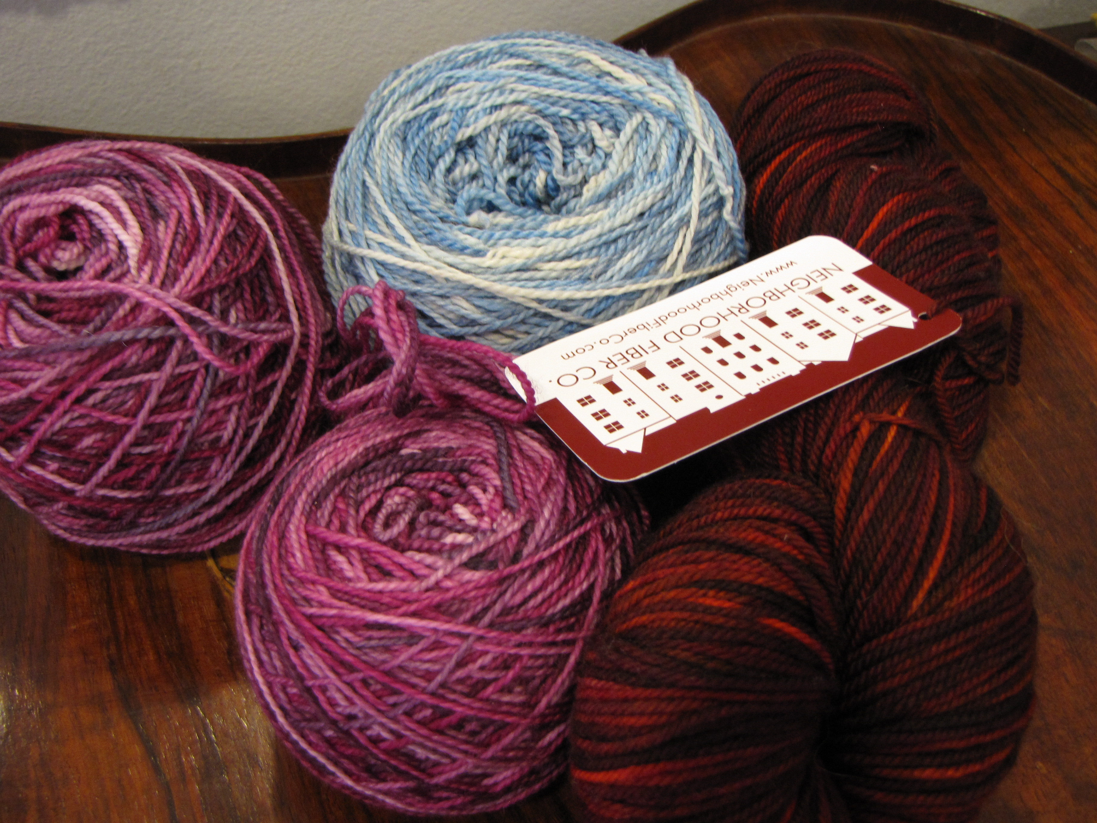 3. A gathering of Neighborhood Fiber Co. sock yarn: semisolid blue, pink, red. The blue is Watershed and the pink (a special edition called Hypercolor) and the red are Studio Sock. All three are yummy, yummy.