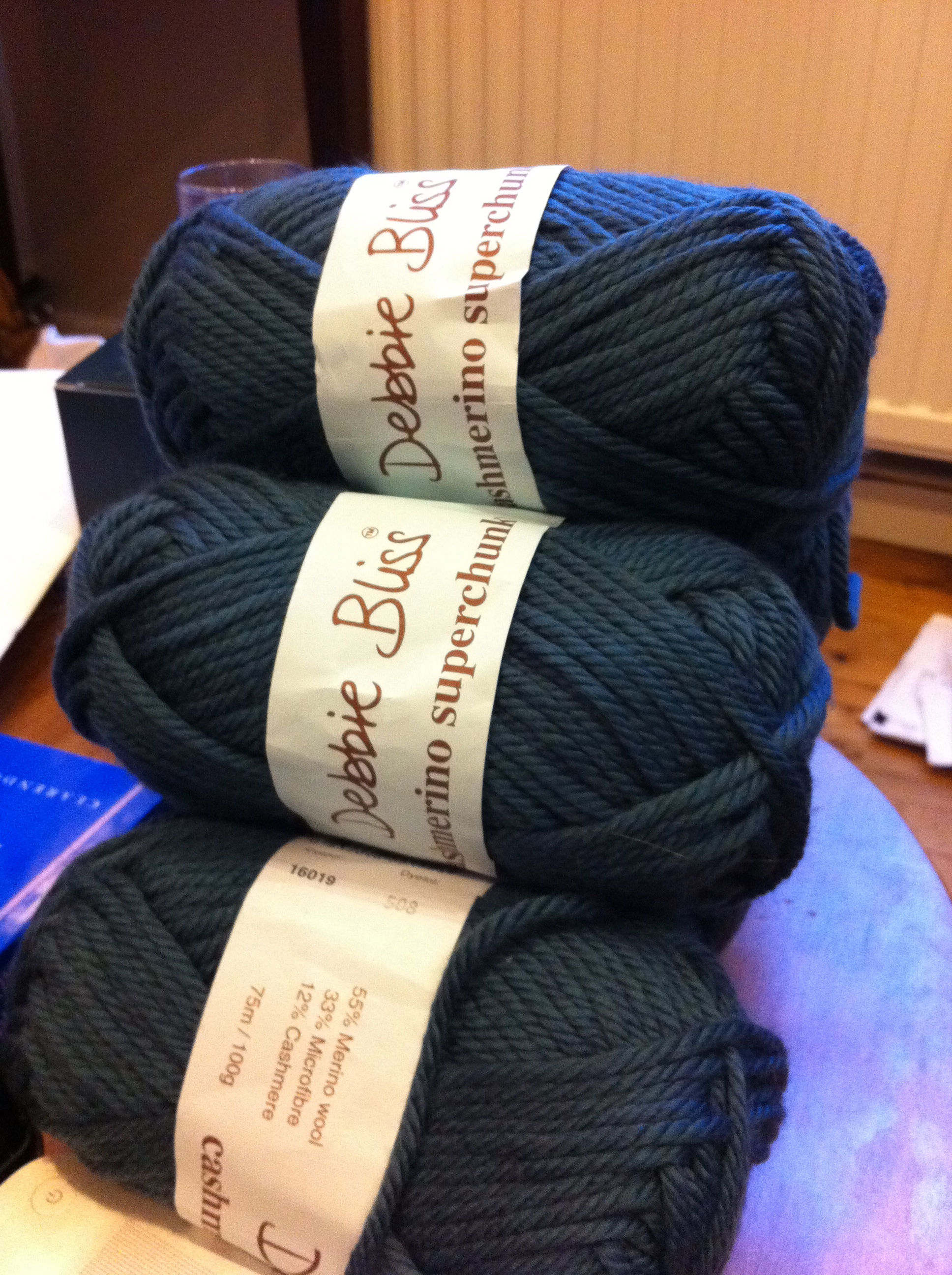 Longtime readers of this blog may feel that the colorway of this yarn seems familiar. That’s right – it’s the same color as the Debbie Bliss Cashmerino Aran that I bought for myself several years ago…the cursed yarn, that was several sweaters and then went into the garbage. [I have never before or since thrown yarn away…but I have never looked back after throwing away that stuff.] I laughed out loud when I saw the color come back to me through Lynn; I am pretty sure that I was there when she bought the Cashmerino Superchunky. But, because she told me to keep the yarn, I kept it, and tried to figure out what it would be.