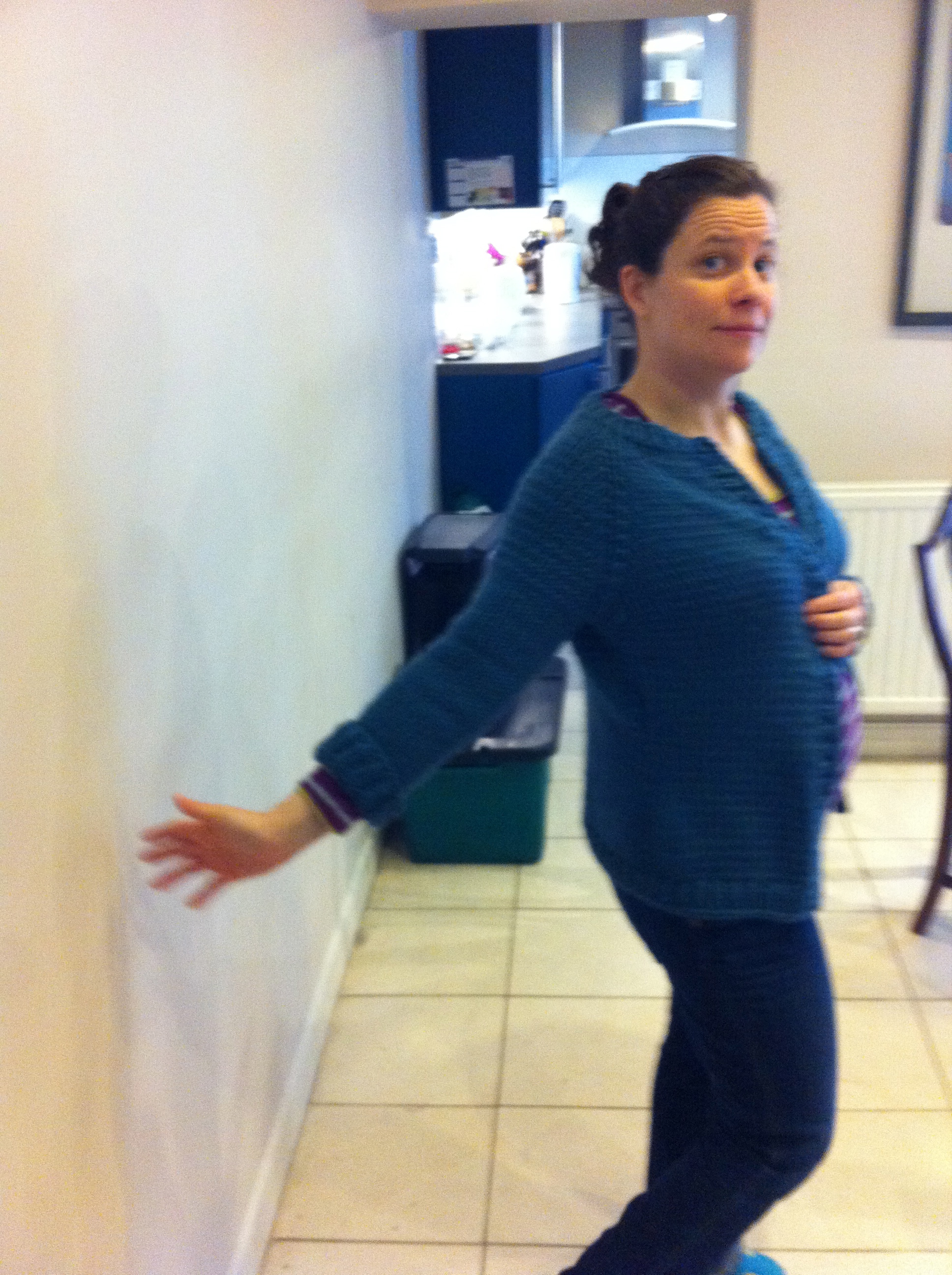 I went back to the US last month to see family and friends, and bought maternity clothes there into the bargain. [It turns out that Oxford has no maternity shops, at least not near us. So odd.] I will now be a fashionable pregnant knitter, instead of a knitter with her jeans held together by a rubber band, which is what I was in December. I didn’t get many sweaters, because of course my plan is to knit a few – so I will welcome your suggestions about maternity-friendly patterns. In the meantime, and without further ado, Pregnancy Sweater #1 – based on the modifications to the Polly Pullover that Susan B. Anderson offered as part of a knitalong in the fall.