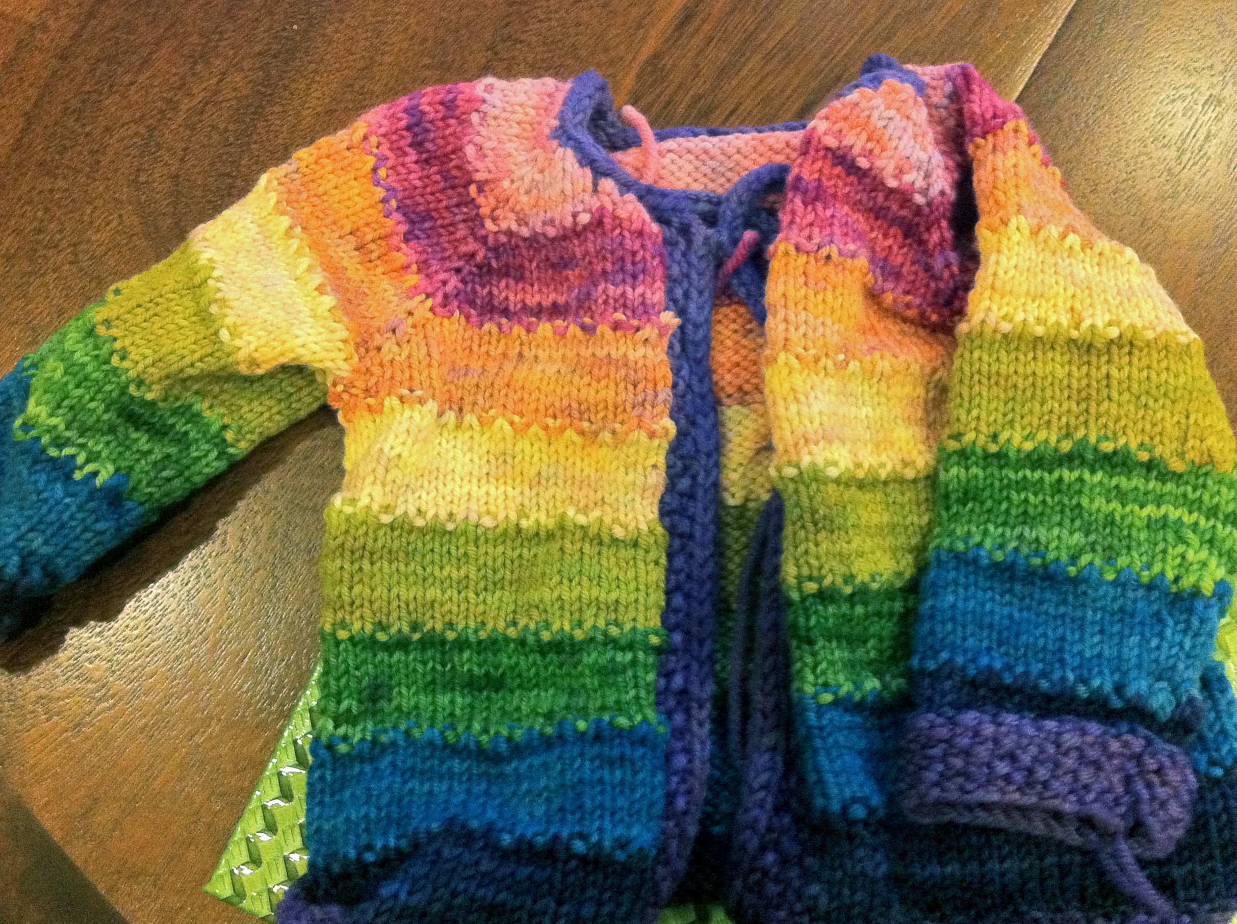 For those of you who have been waiting for the baby sweater: here it is. Made from a pattern that Pearl-McPhee made famous several years ago, this Tulips Cardigan was fun to make and is even more fun to show off. I’ve made several of these for friends over the years, and I’m so cheesily happy to have made one for our little sprog. [Although I haven’t yet woven in the ends…oh dear.]