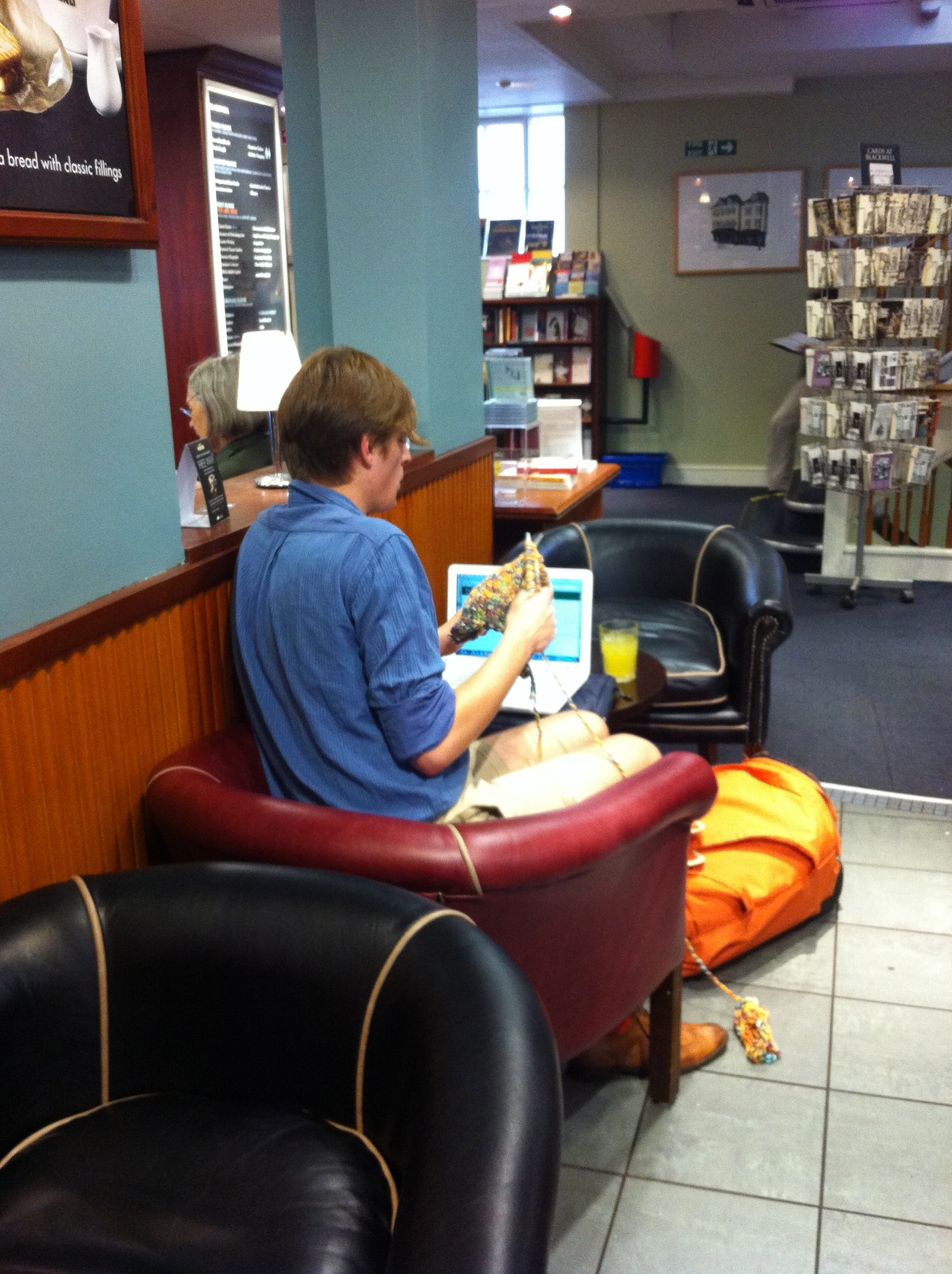 You can tell Mr. Trask and I spent a lot of time in cafes this first month (no furniture or internet in our house). Here's a gentleman knitting in Blackwell's. I think he was a new knitter - he seemed a bit uncomfortable with the sticks and string - but he was hanging in there.