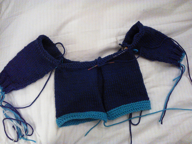 At any rate, I could have just skipped the edging, but the contrast color looked so nice on Catherine’s sleeve. I decided on purple as the edging color, partly because it’s dark and the edges of a toddler’s sweater are bound to get dirty. I’m making slow progress: